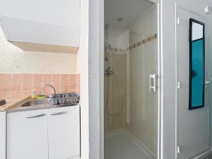 Das Apartment verfügt über ein Schlafzimmer mit einem Bett sowie eine voll ausgestattete Küche mit Kochfeld, Mikrowelle, Kühlschrank, Kaffeemaschine und Teezubereitungsmöglichkeiten. Küchenutensilien und ein Esstisch sind ebenfalls vorhanden.